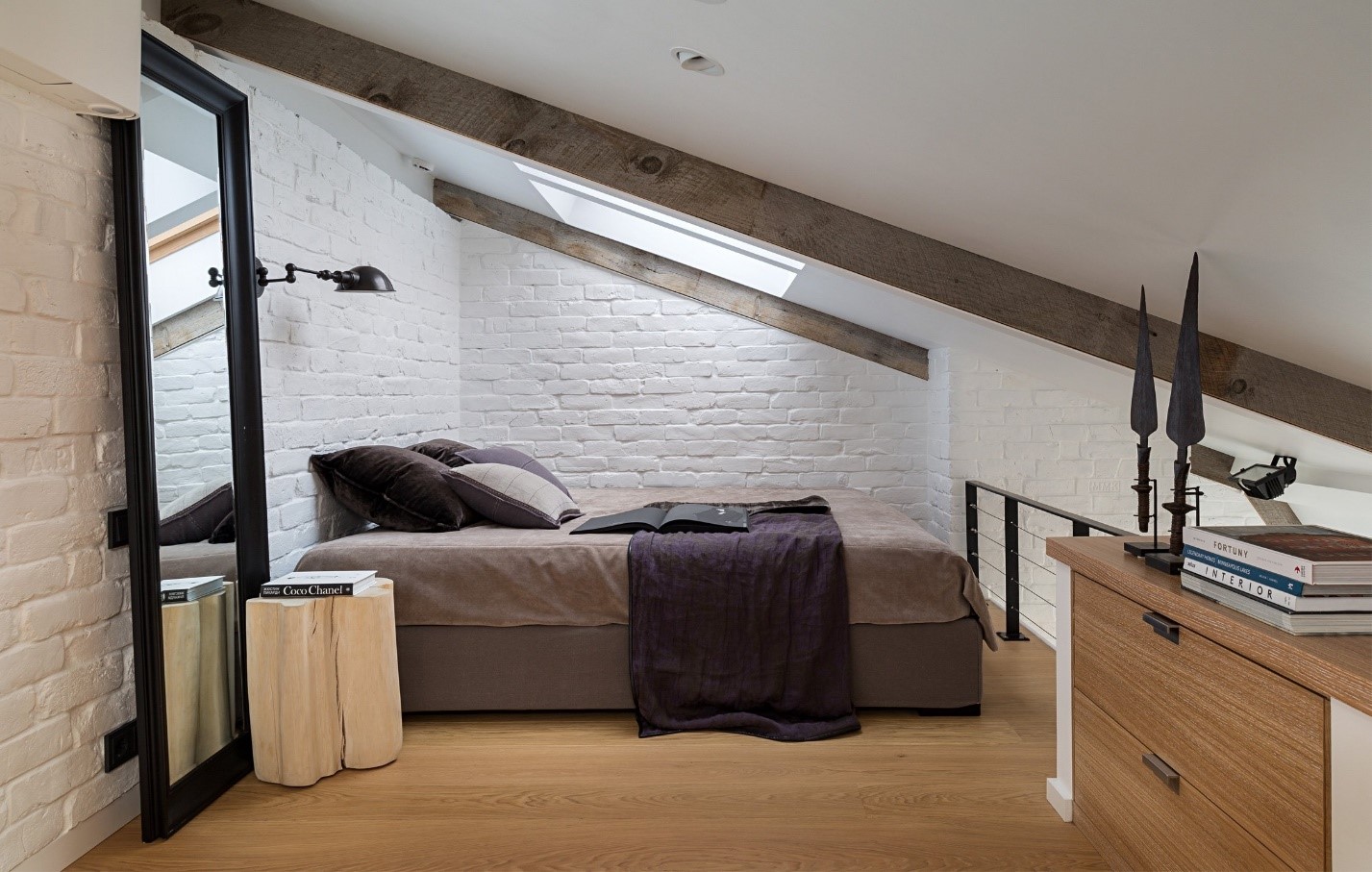 Мансардный этаж идеален для стиля лофт, ведь именно на чердаках промышленных предприятий этот стиль и появился. При оформлении мансарды максимально обыгрывают форму крыши, оставляя открытыми деревянные балки стропильной системы. Также часто делают окна в крыше.